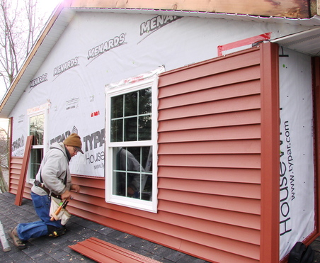 Vinyl siding installation. Multiple profiles to choose from including horizontal lap siding, vertical board & batten siding, and shake or shingle siding.